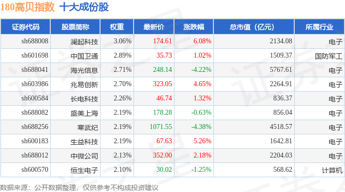 证券之星消息,2月24日,180高贝(000135)指数报收于6701.72点,涨0.43%,成交1211.79亿元,换手率0.87%。当日该指数成份股中,上涨的有32家,中国巨石以9.99%的涨幅领涨,下跌的有26家,中国中免以10.0%的跌幅领跌。