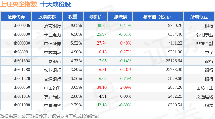 上证央企(000042)指数十大成份股详情如下: