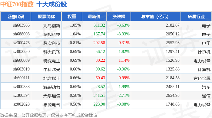 中证700(000907)指数十大成份股详情如下: