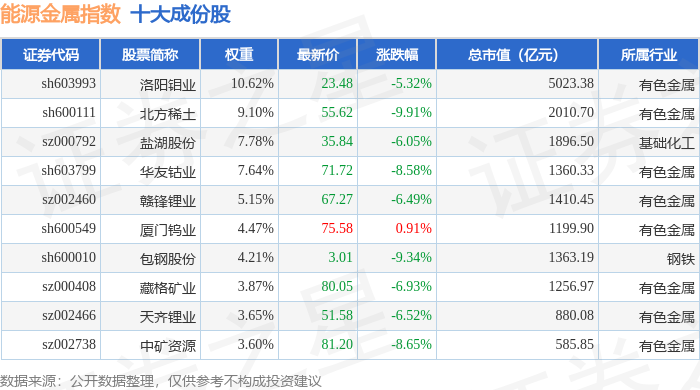能源金属(399366)指数十大成份股详情如下: