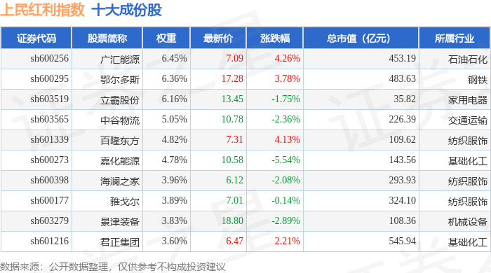 上民红利(000153)指数十大成份股详情如下:
