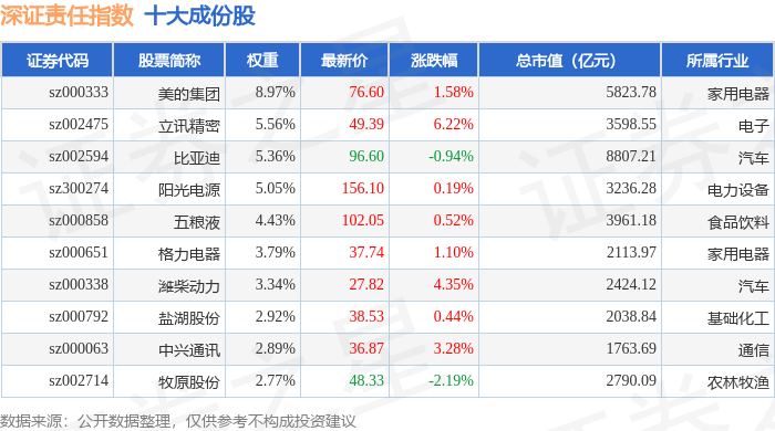 深证责任(399341)指数十大成份股详情如下: