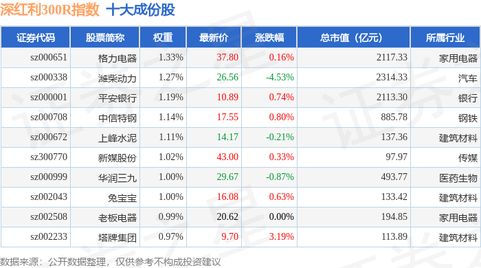 证券之星消息,3月11日,深红利300R(470062)指数报收于8909.69点,涨0.78%,成交2804.93亿元,换手率2.29%。当日该指数成份股中,上涨的有158家,明阳电气以12.0%的涨幅领涨,下跌的有136家,图南股份以6.94%的跌幅领跌。