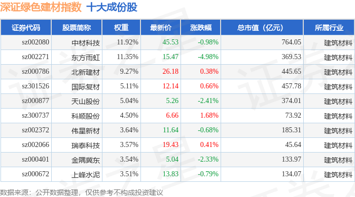 深证绿色建材(970077)指数十大成份股详情如下: