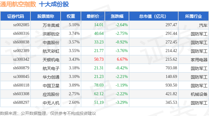 通用航空(980076)指数十大成份股详情如下: