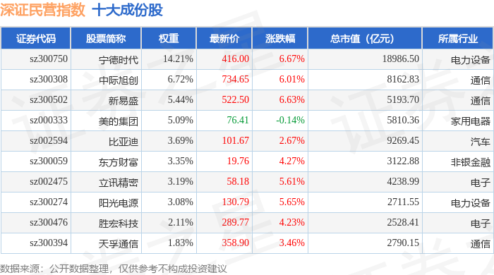 深证民营(399337)指数十大成份股详情如下: