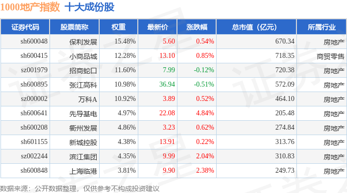 证券之星消息,4月10日,1000地产(399367)指数报收于226711.0点,涨84.0%,成交69.24亿元,换手率85.0%。当日该指数成份股中,上涨的有13家,先导基电以4.84%的涨幅领涨,下跌的有3家,张江高科以0.51%的跌幅领跌。
