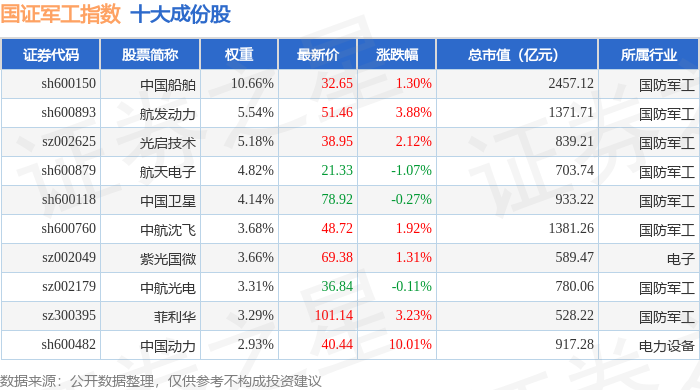 国证军工(399368)指数十大成份股详情如下: