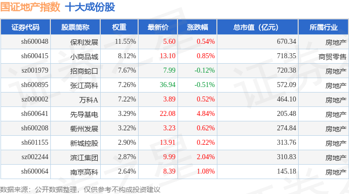 证券之星消息,4月10日,国证地产(399393)指数报收于283482.0点,涨79.0%,成交99.76亿元,换手率103.0%。当日该指数成份股中,上涨的有40家,先导基电以4.84%的涨幅领涨,下跌的有9家,城建发展以1.94%的跌幅领跌。