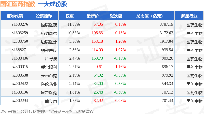 证券之星消息,4月10日,国证医药(399394)指数报收于839549.0点,涨51.0%,成交427.22亿元,换手率132.0%。当日该指数成份股中,上涨的有60家,九安医疗以5.39%的涨幅领涨,下跌的有19家,英科医疗以4.32%的跌幅领跌。