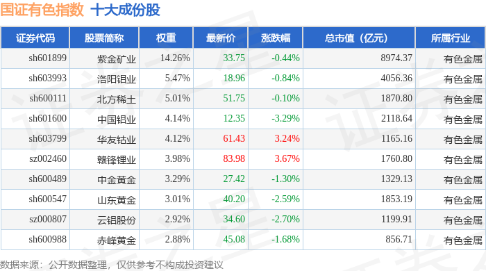 国证有色(399395)指数十大成份股详情如下:
