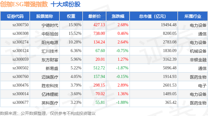 创指ESG增强(970034)指数十大成份股详情如下: