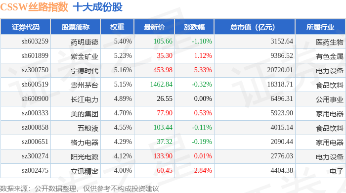 CSSW丝路(000853)指数十大成份股详情如下: