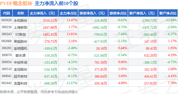 从资金流向上来看,当日PVDF概念板块主力资金净流出5.59亿元,游资资金净流入1.61亿元,散户资金净流入3.99亿元。PVDF概念板块个股资金流向见下表: