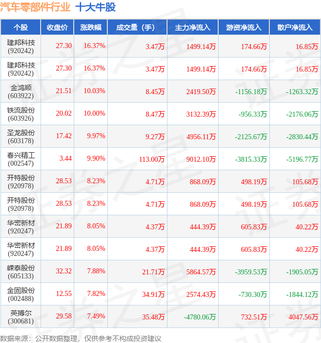 个股表现方面,汽车零部件行业当日领涨股为建邦科技(920242),该股当日报收27.3,上涨16.37%,成交量3.47万,主力资金净流入1499.14万元。建邦科技(920242)以上涨16.37%紧随其后,该股当日成交量3.47万,主力资金净流入1499.14万元。除此之外,金鸿顺(603922)、铁流股份(603926)、圣龙股份(603178)均进入当日牛股之列。具体个股列表见下表: