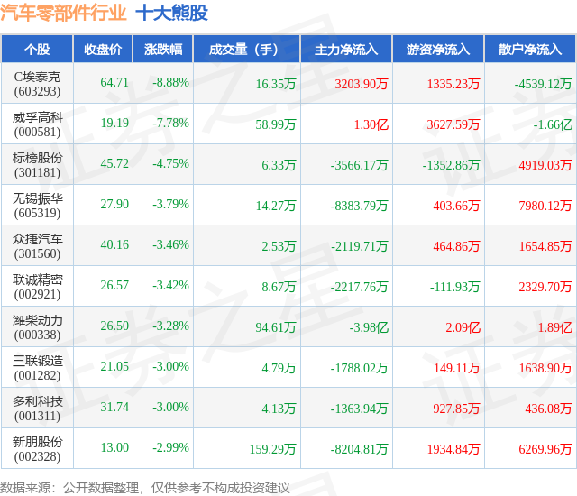 个股表现方面,汽车零部件行业当日领跌股为C埃泰克(603293),该股当日报收64.71,下跌8.88%,成交量16.35万,主力资金净流入3203.9万元。威孚高科(000581)以下跌7.78%紧随其后,该股当日成交量58.99万,主力资金净流入1.3亿元。除此之外,标榜股份(301181)、无锡振华(605319)、众捷汽车(301560)均进入当日熊股之列。具体个股列表见下表: