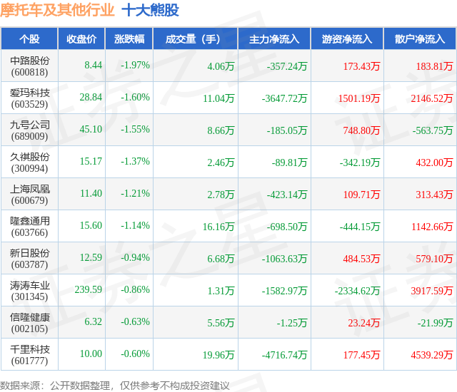 个股表现方面,摩托车及其他行业当日领跌股为中路股份(600818),该股当日报收8.44,下跌1.97%,成交量4.06万,主力资金净流出357.24万元。爱玛科技(603529)以下跌1.6%紧随其后,该股当日成交量11.04万,主力资金净流出3647.72万元。除此之外,九号公司(689009)、久祺股份(300994)、上海凤凰(600679)均进入当日熊股之列。具体个股列表见下表: