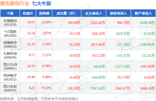 个股表现方面,黑色家电行业当日领涨股为兆驰股份(002429),该股当日报收10.67,上涨4.92%,成交量149.9万,主力资金净流入3222.42万元。*ST高斯(002848)以上涨3.67%紧随其后,该股当日成交量10.11万,主力资金净流入838.24万元。除此之外,创维数字(000810)、九联科技(688609)、四川九洲(000801)均进入当日牛股之列。具体个股列表见下表: