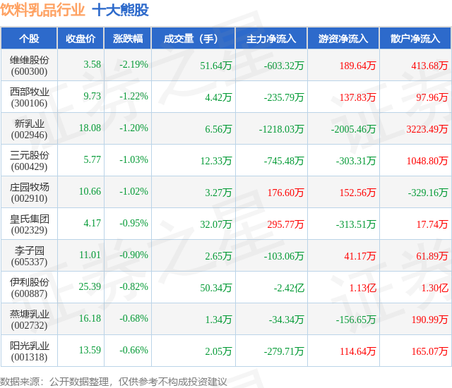 个股表现方面,饮料乳品行业当日领跌股为维维股份(600300),该股当日报收3.58,下跌2.19%,成交量51.64万,主力资金净流出603.32万元。西部牧业(300106)以下跌1.22%紧随其后,该股当日成交量4.42万,主力资金净流出235.79万元。除此之外,新乳业(002946)、三元股份(600429)、庄园牧场(002910)均进入当日熊股之列。具体个股列表见下表: