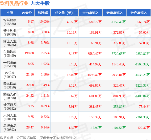 个股表现方面,饮料乳品行业当日领涨股为均瑶健康(605388),该股当日报收8.87,上涨10.05%,成交量46.59万,主力资金净流入582.72万元。骑士乳业(920786)以上涨3.7%紧随其后,该股当日成交量10.16万,主力资金净流入168.91万元。除此之外,骑士乳业(920786)、东鹏饮料(605499)、一鸣食品(605179)均进入当日牛股之列。具体个股列表见下表: