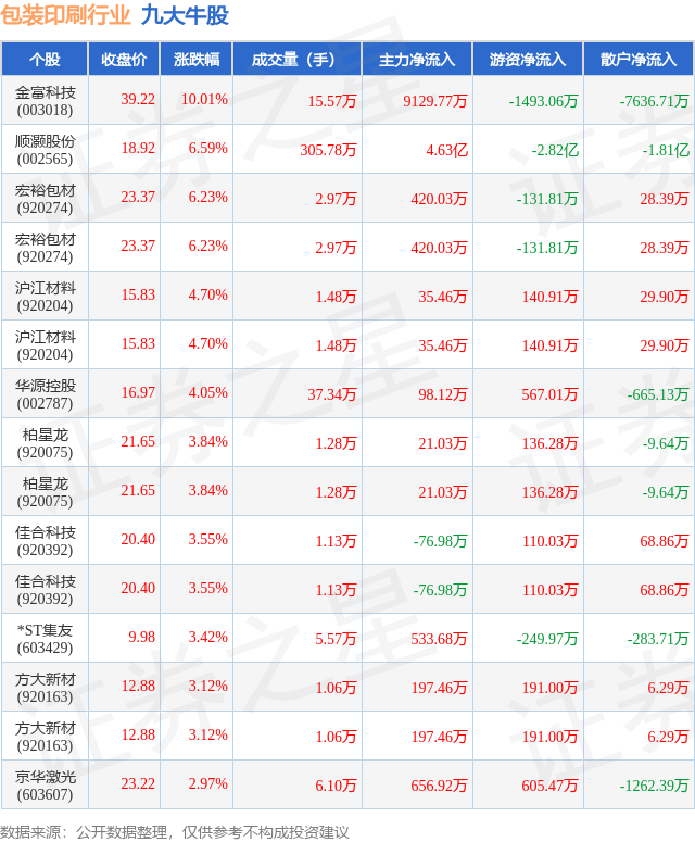 个股表现方面,包装印刷行业当日领涨股为金富科技(003018),该股当日报收39.22,上涨10.01%,成交量15.57万,主力资金净流入9129.77万元。顺灏股份(002565)以上涨6.59%紧随其后,该股当日成交量305.78万,主力资金净流入4.63亿元。除此之外,宏裕包材(920274)、宏裕包材(920274)、沪江材料(920204)均进入当日牛股之列。具体个股列表见下表: