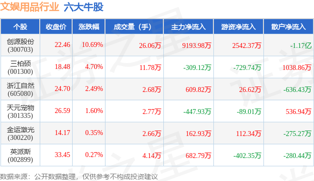 个股表现方面,文娱用品行业当日领涨股为创源股份(300703),该股当日报收22.46,上涨10.69%,成交量26.06万,主力资金净流入9193.98万元。三柏硕(001300)以上涨4.7%紧随其后,该股当日成交量11.78万,主力资金净流出309.12万元。除此之外,浙江自然(605080)、天元宠物(301335)、金运激光(300220)均进入当日牛股之列。具体个股列表见下表: