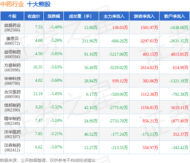 个股表现方面,中药行业当日领跌股为益盛药业(002566),该股当日报收7.53,下跌5.4%,成交量12.0万,主力资金净流入136.03万元。康恩贝(600572)以下跌5.26%紧随其后,该股当日成交量211.96万,主力资金净流出666.26万元。除此之外,益佰制药(600594)、方盛制药(603998)、华神科技(000790)均进入当日熊股之列。具体个股列表见下表: