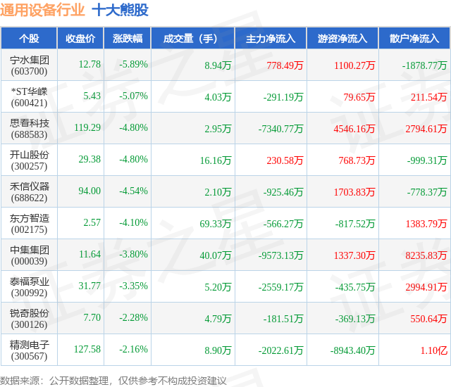 个股表现方面,通用设备行业当日领跌股为宁水集团(603700),该股当日报收12.78,下跌5.89%,成交量8.94万,主力资金净流入778.49万元。*ST华嵘(600421)以下跌5.07%紧随其后,该股当日成交量4.03万,主力资金净流出291.19万元。除此之外,思看科技(688583)、开山股份(300257)、禾信仪器(688622)均进入当日熊股之列。具体个股列表见下表: