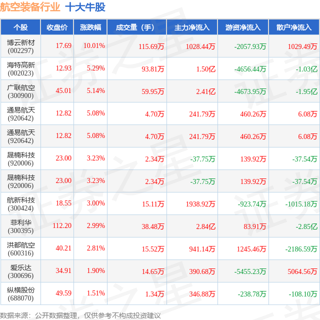 个股表现方面,航空装备行业当日领涨股为博云新材(002297),该股当日报收17.69,上涨10.01%,成交量115.69万,主力资金净流入1028.44万元。海特高新(002023)以上涨5.29%紧随其后,该股当日成交量93.81万,主力资金净流入1.5亿元。除此之外,广联航空(300900)、通易航天(920642)、通易航天(920642)均进入当日牛股之列。具体个股列表见下表: