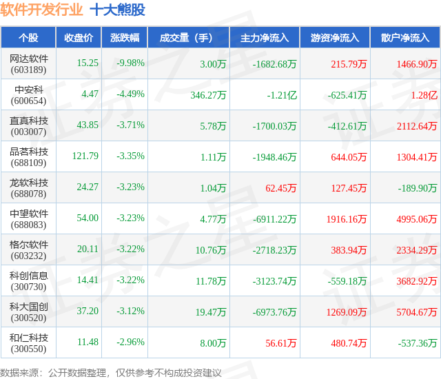 个股表现方面,软件开发行业当日领跌股为网达软件(603189),该股当日报收15.25,下跌9.98%,成交量3.0万,主力资金净流出1682.68万元。中安科(600654)以下跌4.49%紧随其后,该股当日成交量346.27万,主力资金净流出1.21亿元。除此之外,直真科技(003007)、品茗科技(688109)、龙软科技(688078)均进入当日熊股之列。具体个股列表见下表: