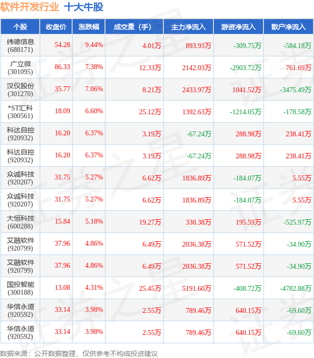 个股表现方面,软件开发行业当日领涨股为纬德信息(688171),该股当日报收54.28,上涨9.44%,成交量4.01万,主力资金净流入893.93万元。广立微(301095)以上涨7.38%紧随其后,该股当日成交量12.33万,主力资金净流入2142.03万元。除此之外,汉仪股份(301270)、*ST汇科(300561)、科达自控(920932)均进入当日牛股之列。具体个股列表见下表: