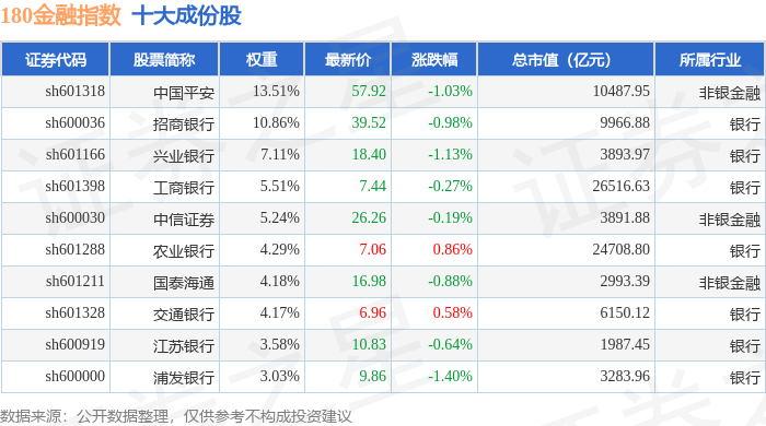 证券之星消息,4月17日,180金融(000018)指数报收于541646.0点,跌55.0%,成交320.68亿元,换手率19.0%。当日该指数成份股中,上涨的有5家,农业银行以0.86%的涨幅领涨,下跌的有34家,中国人保以1.47%的跌幅领跌。