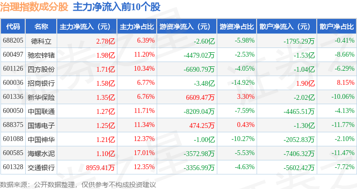 资金流向方面,治理指数(000019)成份股当日主力资金净流出合计81.54亿元,游资资金净流入合计32.22亿元,散户资金净流入合计49.32亿元。成份股资金流向详情见下表: