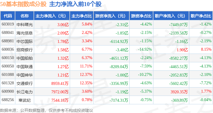 资金流向方面,50基本(000052)指数成份股当日主力资金净流出合计90.93亿元,游资资金净流入合计38.21亿元,散户资金净流入合计52.72亿元。成份股资金流向详情见下表: