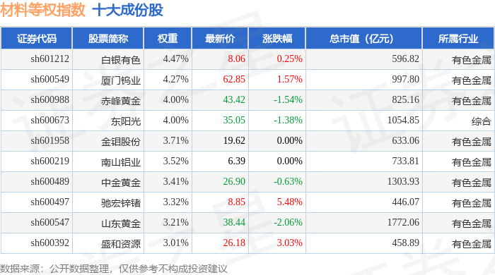 证券之星消息,4月17日,材料等权(000071)指数报收于555642.0点,跌15.0%,成交819.09亿元,换手率163.0%。当日该指数成份股中,上涨的有15家,驰宏锌锗以5.48%的涨幅领涨,下跌的有33家,扬农化工以8.35%的跌幅领跌。