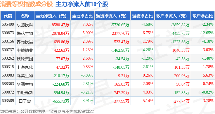 资金流向方面,消费等权(000074)指数成份股当日主力资金净流出合计15.76亿元,游资资金净流入合计11.64亿元,散户资金净流入合计4.13亿元。成份股资金流向详情见下表: