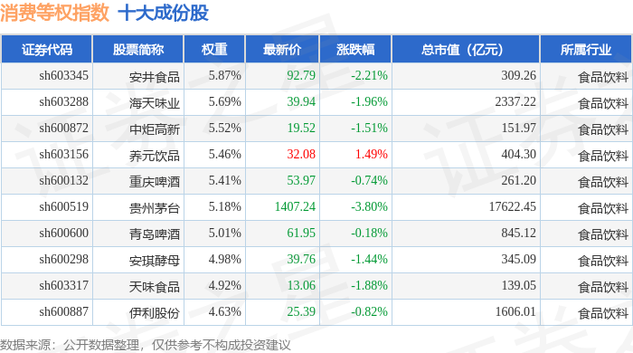 证券之星消息,4月17日,消费等权(000074)指数报收于666279.0点,跌104.0%,成交219.73亿元,换手率76.0%。当日该指数成份股中,上涨的有6家,东鹏饮料以2.85%的涨幅领涨,下跌的有24家,贵州茅台以3.8%的跌幅领跌。