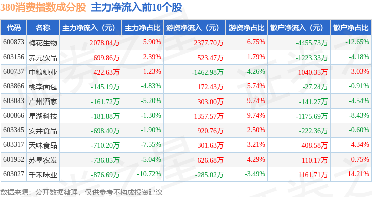 资金流向方面,380消费(000108)指数成份股当日主力资金净流出合计1.34亿元,游资资金净流入合计5822.46万元,散户资金净流入合计7553.31万元。成份股资金流向详情见下表: