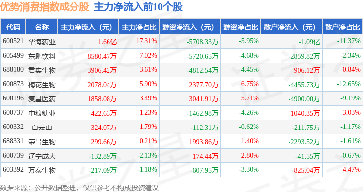 资金流向方面,优势消费(000147)指数成份股当日主力资金净流出合计19.37亿元,游资资金净流入合计14.08亿元,散户资金净流入合计5.29亿元。成份股资金流向详情见下表: