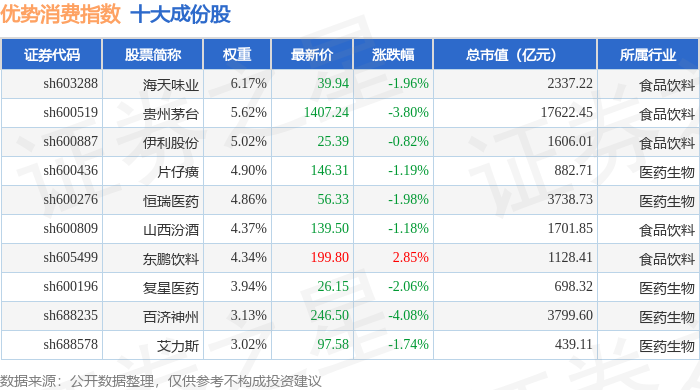 优势消费(000147)指数十大成份股详情如下: