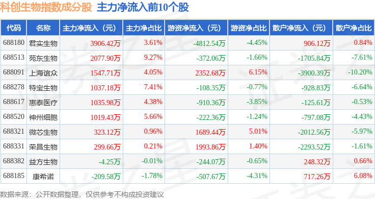 资金流向方面,科创生物(000683)指数成份股当日主力资金净流出合计6.98亿元,游资资金净流入合计3.45亿元,散户资金净流入合计3.53亿元。成份股资金流向详情见下表:
