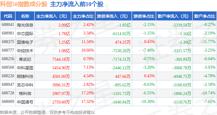 资金流向方面,科创50(000688)指数成份股当日主力资金净流出合计36.14亿元,游资资金净流入合计36.11亿元,散户资金净流入合计284.37万元。成份股资金流向详情见下表: