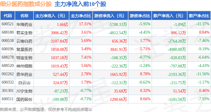 资金流向方面,细分医药(000814)指数成份股当日主力资金净流出合计39.53亿元,游资资金净流入合计11.79亿元,散户资金净流入合计27.75亿元。成份股资金流向详情见下表:
