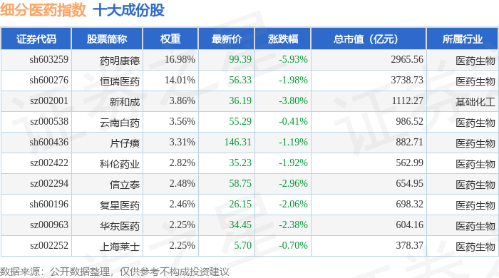 细分医药(000814)指数十大成份股详情如下: