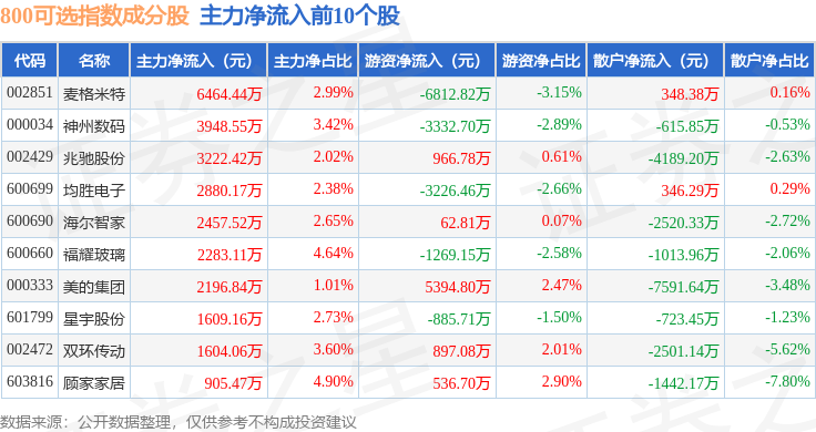 资金流向方面,800可选(000931)指数成份股当日主力资金净流出合计25.99亿元,游资资金净流入合计7.68亿元,散户资金净流入合计18.31亿元。成份股资金流向详情见下表: