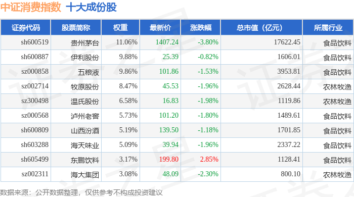 证券之星消息,4月17日,中证消费(000932)指数报收于1427637.0点,跌148.0%,成交302.27亿元,换手率107.0%。当日该指数成份股中,上涨的有6家,乖宝宠物以3.73%的涨幅领涨,下跌的有32家,贵州茅台以3.8%的跌幅领跌。