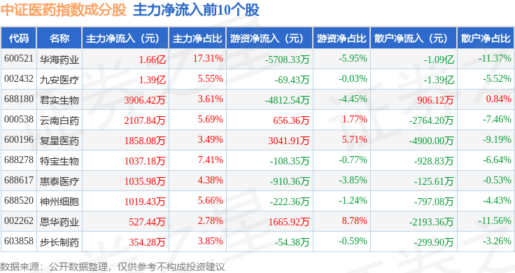 资金流向方面,中证医药(000933)指数成份股当日主力资金净流出合计42.97亿元,游资资金净流入合计14.12亿元,散户资金净流入合计28.84亿元。成份股资金流向详情见下表: