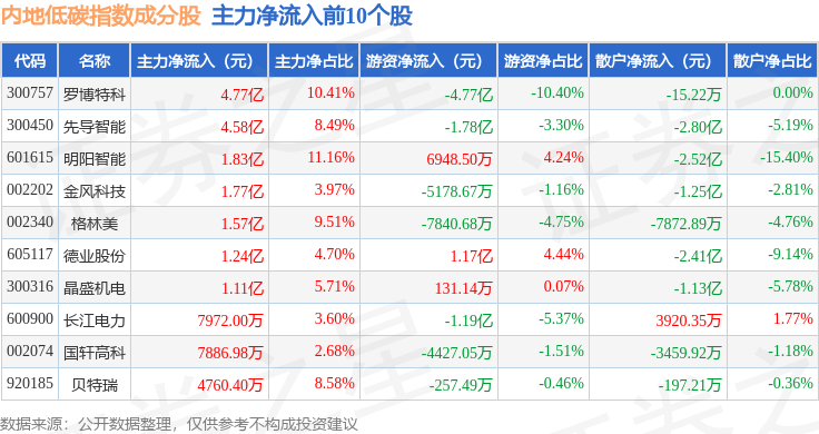 资金流向方面,内地低碳(000977)指数成份股当日主力资金净流出合计50.23亿元,游资资金净流入合计22.93亿元,散户资金净流入合计27.73亿元。成份股资金流向详情见下表: