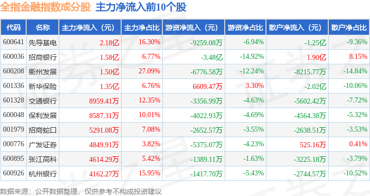 资金流向方面,全指金融(000992)指数成份股当日主力资金净流出合计20.07亿元,游资资金净流入合计2.68亿元,散户资金净流入合计17.39亿元。成份股资金流向详情见下表: