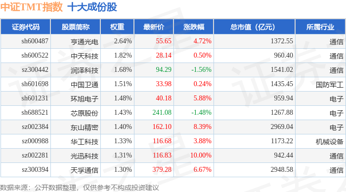 中证TMT(000998)指数十大成份股详情如下: